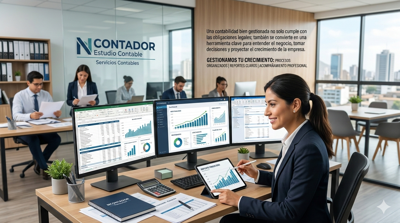 En NCONTADOR Estudio Contable gestionamos la contabilidad de tu empresa con procesos organizados, control permanente y reportes financieros claros, brindando acompañamiento profesional continuo para que tu información contable esté siempre actualizada y confiable.